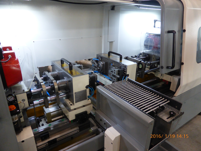 為了降低操作者勞動(dòng)強(qiáng)度,該機(jī)床配置了自動(dòng)上下料機(jī)構(gòu)。該機(jī)構(gòu)數(shù)控控制,一次安裝28支工件。送入加工區(qū)域后,機(jī)床會(huì)自動(dòng)依次加工,直至完成所有28支工件的加工。送料架再退出加工區(qū),由人工將成品取走。
