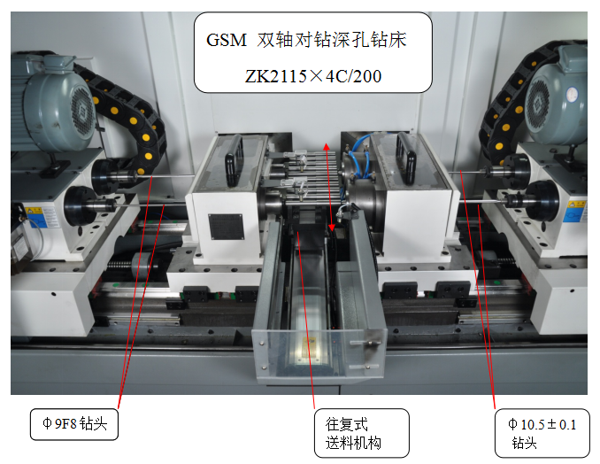 1. 機(jī)床結(jié)構(gòu)的選擇:因為φ9f8 (+0.013-0.035)孔徑公差要求非常高,又加之零件為大批量生產(chǎn),效率要求極高,所以深孔加工過程需要穩(wěn)定可靠,并且要方便刀具及工裝的調(diào)整。所以,機(jī)床的主軸數(shù)量選擇為2軸。如果選用4軸機(jī)床,則同時調(diào)整4支高精度的刀具,難度很大,也很難保證加工質(zhì)量。為了提高加工效率,考慮將左側(cè)的φ10.5±0.1深孔與φ9f8 (+0.013-0.035)同時加工。這樣可以保證工件一次裝夾,完成左右兩側(cè)孔的加工,大大提高了加工效率,加工效率比通常的四軸機(jī)床還要高很多。所以機(jī)床選擇為雙軸對鉆深孔鉆床。加工孔徑范圍:φ3~φ15。機(jī)床結(jié)構(gòu)參見下圖。